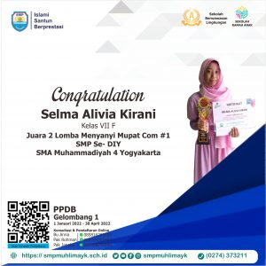 Anda ada di : Home / Prestasi / Selma Alivia Kirani dari kelas 7F Memperoleh Juara 2 Lomba Menyanyi Mupat Com #1 se Daerah Istimewa Yogyakarta